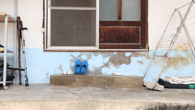 Old house entrance with blue slippers