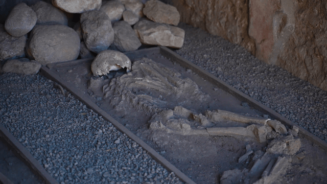 Ancient skeleton remains in a stone tomb