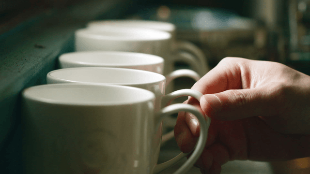 Placing a cup of coffee on a vintage table