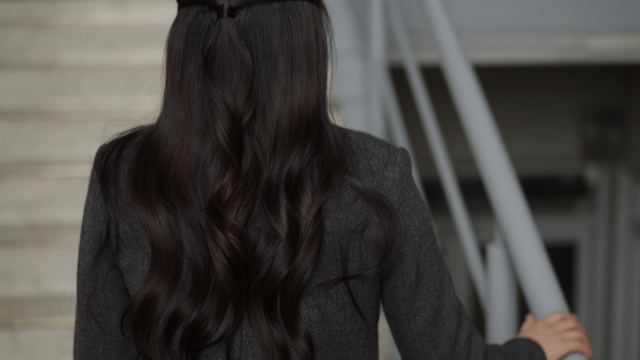 Back view of woman descending stairs