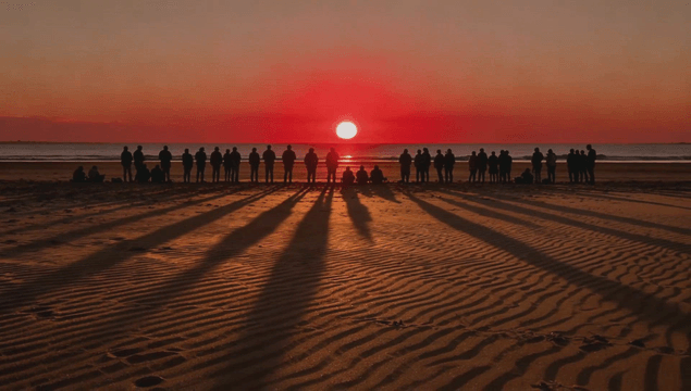 Crowd gathered on the beach at sunrise