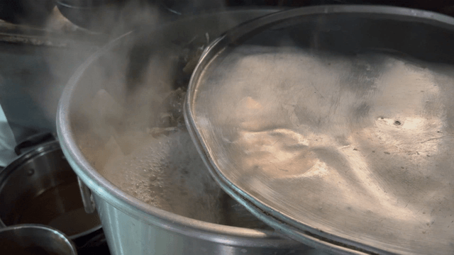 Boiling bone soup with steam rising