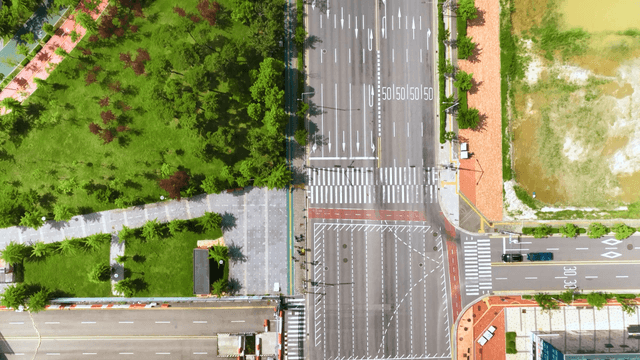 Aerial view of a modern city intersection