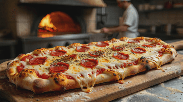 Scene Where a Chef Sprinkles Cheese on a Freshly Baked Pizza