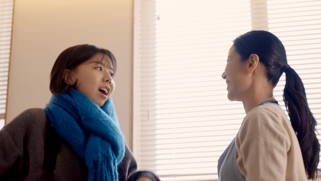 Mother and daughter sitting on sofa, looking straight ahead and smiling