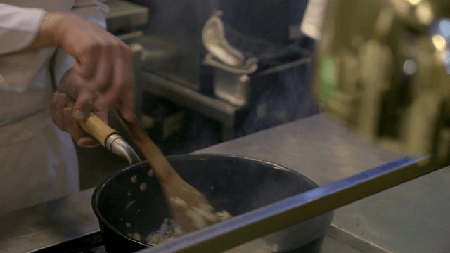 Chef preparing a flaming stir-fried squid on a gas stove in a kitchen
