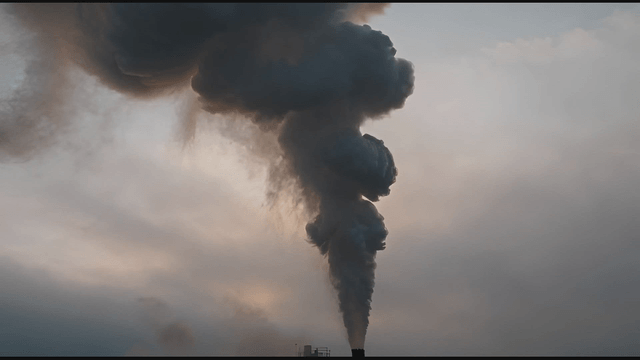 Person wearing gas mask walking against backdrop of smoke-emitting factory