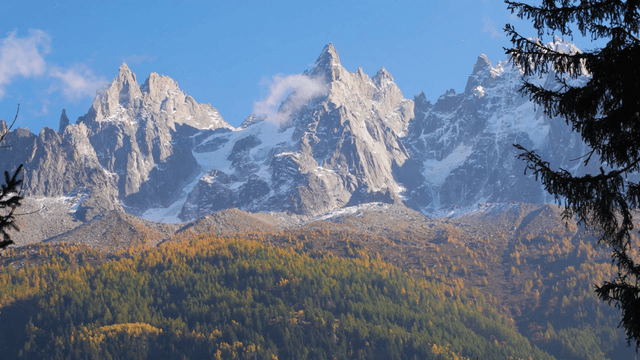 Snow-capped mountains with autumn foliage