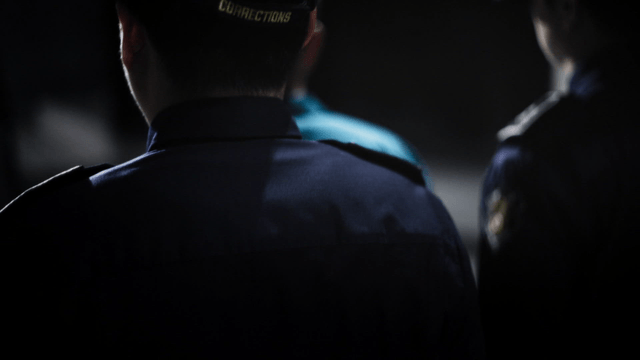 Guards in a dark prison corridor