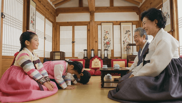 Family of men dressed in hanbok gathered in front of ancestral rite table