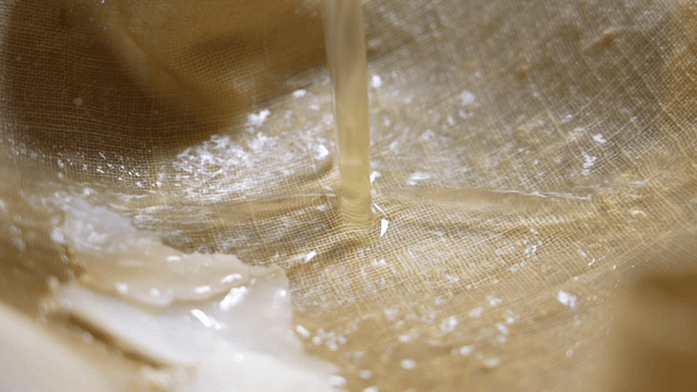 Pouring melted wax through a sieve cloth