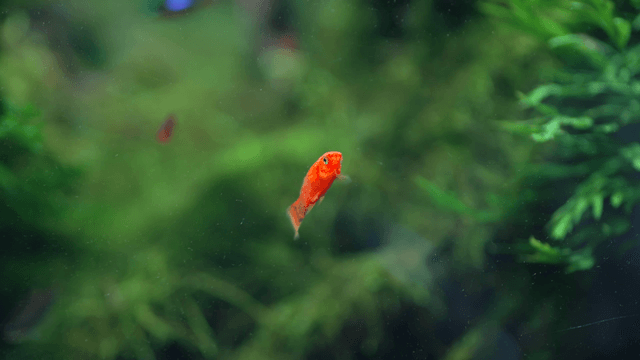Small orange fish swimming among water plants