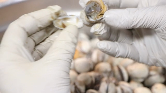Hands wearing rubber gloves sorting freshly caught anchovies