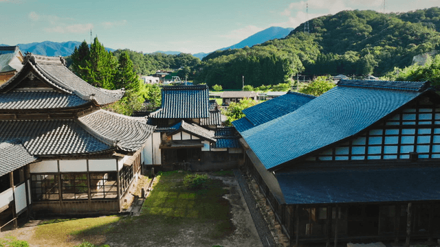 Village of traditional Japanese houses, popular with visitors, beneath a forested mountain