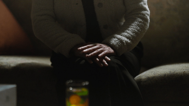 Woman wearing beige cardigan in living room