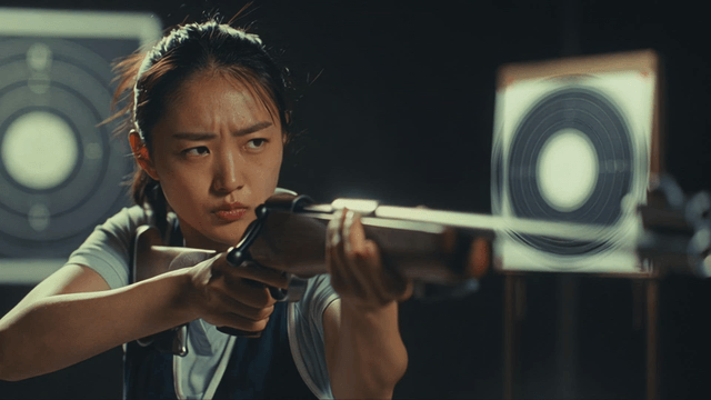 Person aiming at a target in a shooting range