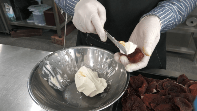 Person preparing cream cheese and dried persimmons