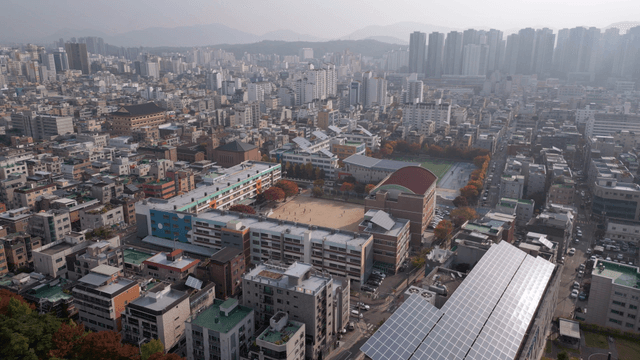 Aerial view of a school and surrounding city