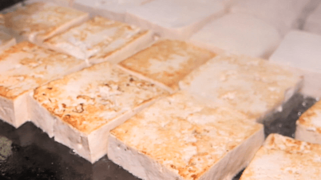 Tofu being grilled on a hot pan