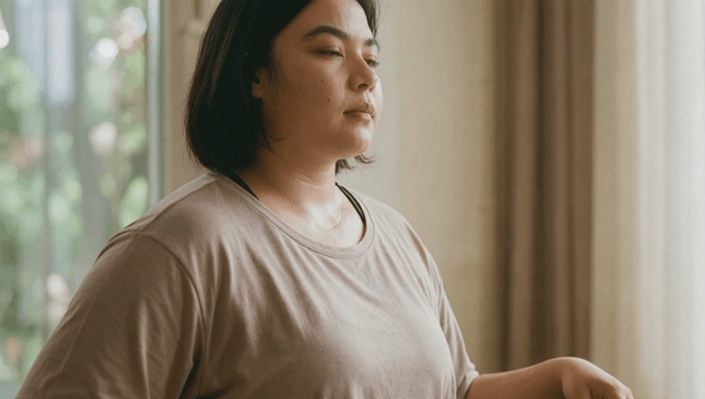 Fat white woman sitting on comfortable chair with her stomach exposed