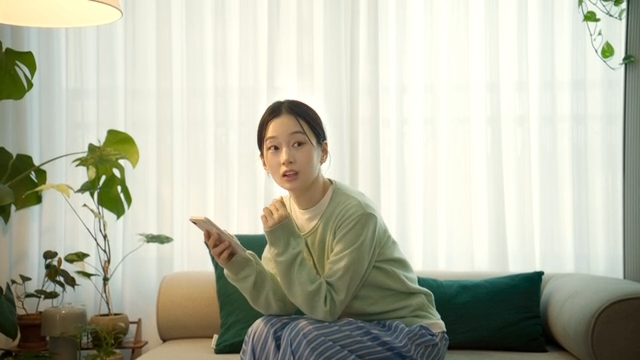 Woman using smartphone on a cozy sofa