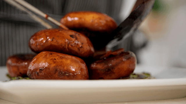Gourmet grilled mushrooms with sauce drizzled on plate