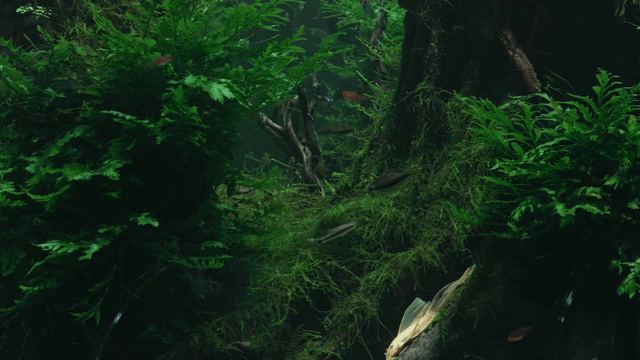 Aquarium with lush green plants and fish