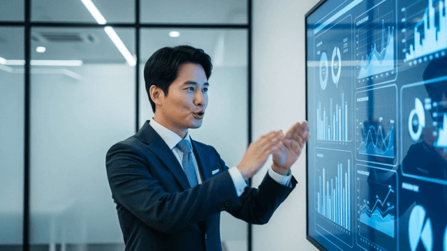 Man in a suit presenting in front of a screen