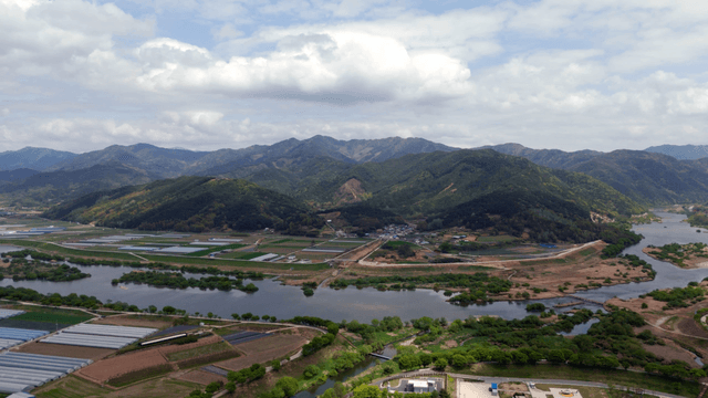 Expansive farmland with a winding river