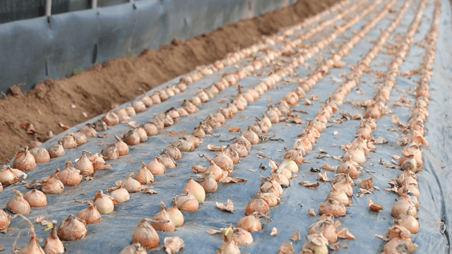Onions carefully planted in soil