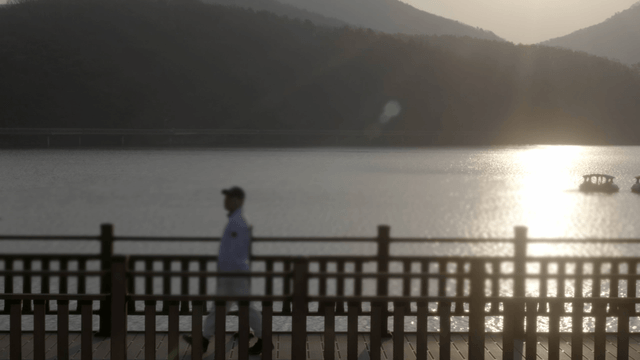 People walking on a wooden boardwalk along the lakeside of Baegunhosu Lake