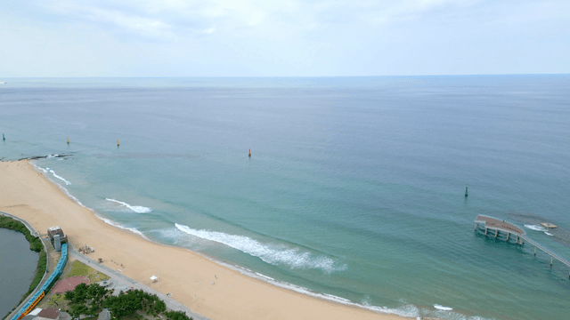 Snow-covered beach with crashing waves and a lighthouse on a breakwater