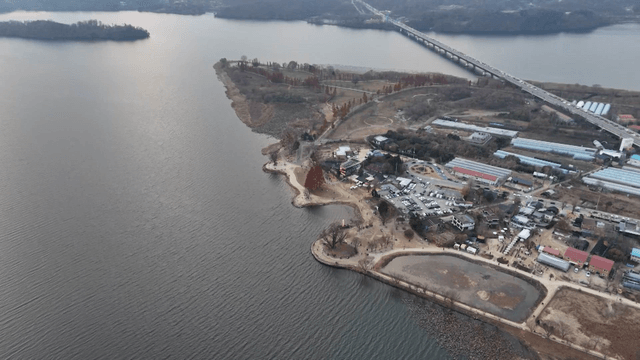 View of a riveside with farmlands and park