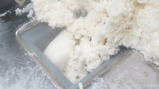 A worker taking out rice cake dough from a machine