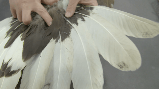 Hand examining feathers of white-tailed eagle