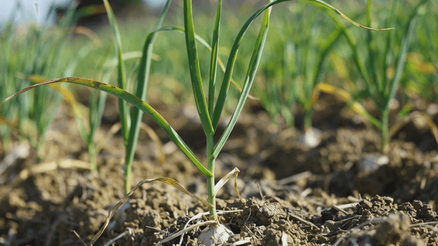 Garlic plants growing in a sunny field