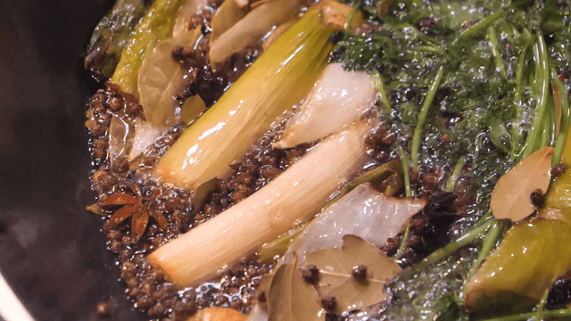 Boiling vegetables and spices in a large pot to make broth