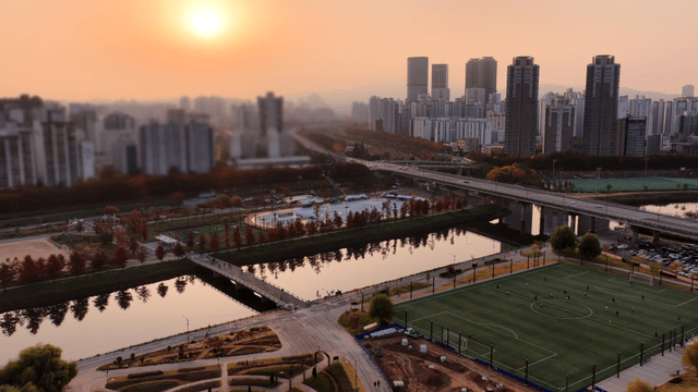 Cityscape at Sunset with Lush Park