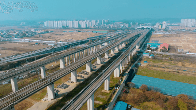 High-speed train on elevated tracks