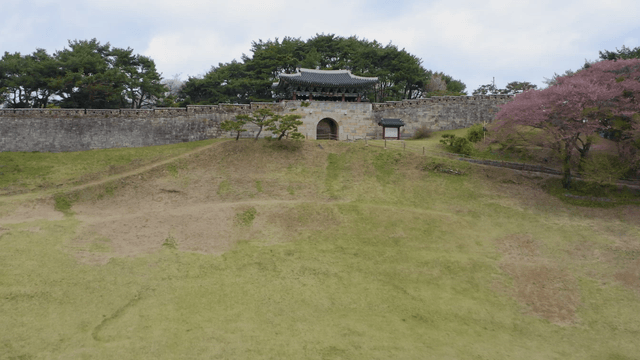 벚꽃과 전통 성문이 조화를 이루는 성곽