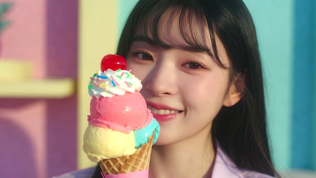 컬러풀한 아이스크림을 먹는 젊은 여성