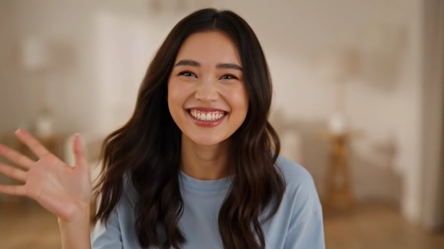 헬스장에서 정면을 보고 웃으며 손을 흔드는 여성