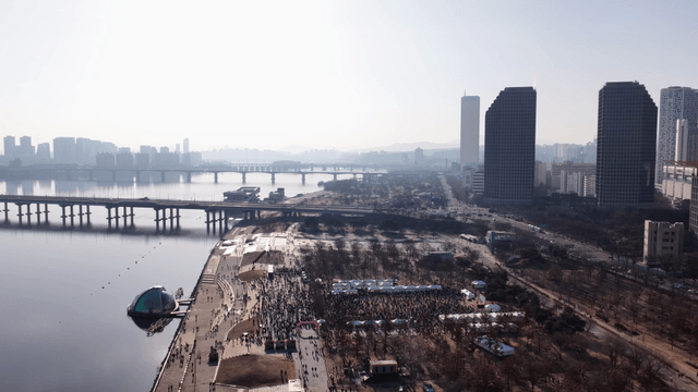 현대 건물이 빽빽히 들어찬 강변 도시의 파노라마