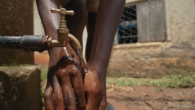 세면대 수도꼭지에서 흐르는 물로 칫솔을 씻는 모습