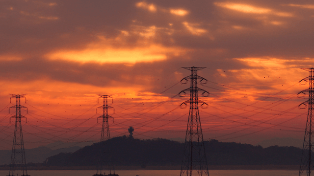 강 위 일몰을 배경으로 이어진 송전탑 전선