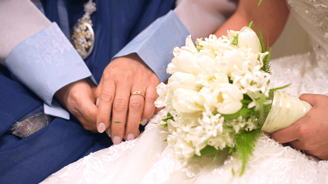 꽃을 든 신부와 어머니가 손을 잡고 있는 모습