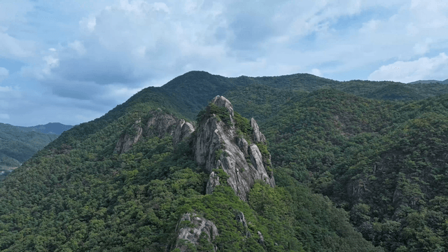 구름 낀 하늘 아래 푸른 바위 산봉우리