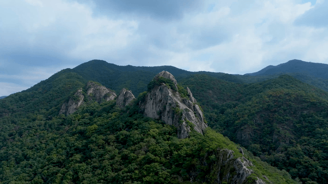 맑고 푸른 하늘 아래 울창한 녹색 바위산