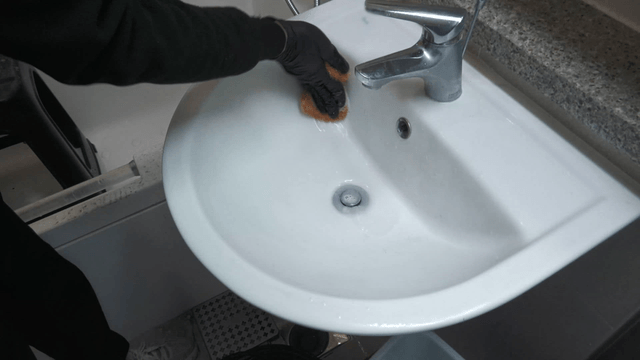 고무 장갑을 끼고 세면대에 구정물이 나오는 걸래를 짜는 사람