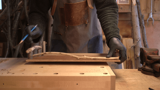 햇빛이 비치는 작업장에서 목공예를 하는 장인
